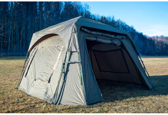 La surtoile est fabriquée en matériau M-TEC300 avec une texture hexagonale, offrant une résistance mécanique accrue et une colonne d’eau de 10 000 mm. Elle couvre le toit ainsi qu’une partie des parois latérales, tout en conservant un accès complet à toutes les fenêtres et aux panneaux latéraux amovibles.